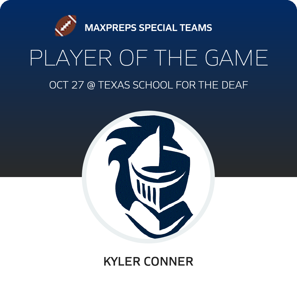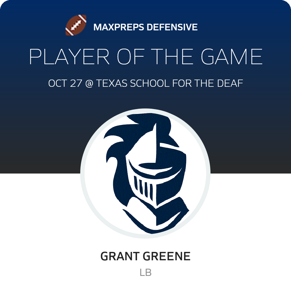 Congratulations to #24 Kyler Conner (overall, offensive and special teams) and #25 Grant Greene (defensive) for being selected the Hill Country Christian School of Austin Football Players of the Game.