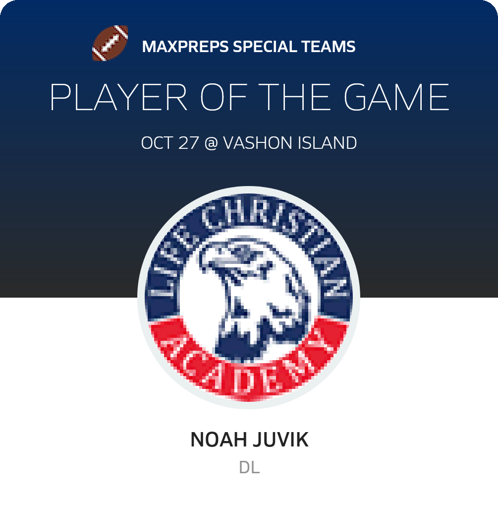 Congratulations to #2 Jabez Boyd (overall and offensive), #7 Dylan Martinson (defensive) and #99 Noah Juvik (special teams) for being selected the Life Christian Academy Football Players of the Game.