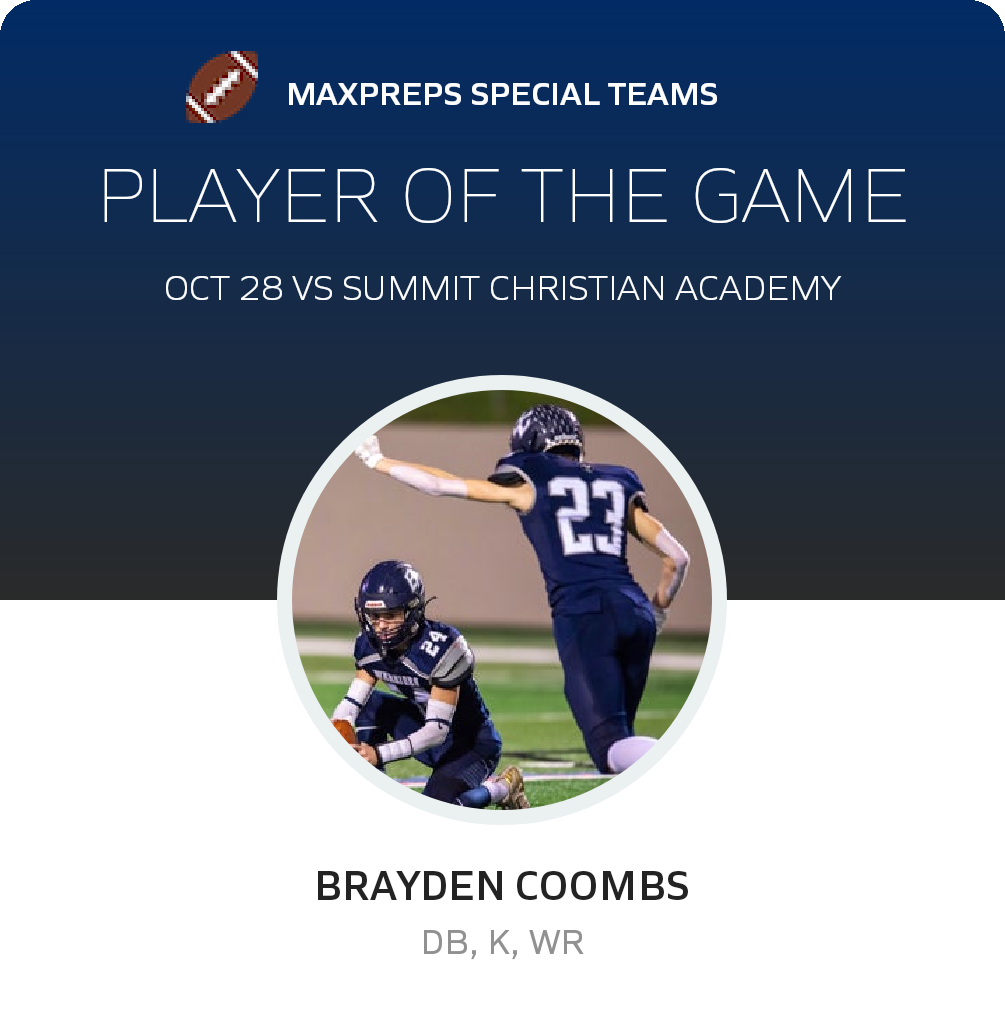 Congratulations to #22 James Schroeder (overall), #3 Colt Wheelock (offensive), #10 Justin Mcgarity (defensive) and #2 Brayden Coombs (special teams) for being selected the Bracken Christian Football Players of the Game.
