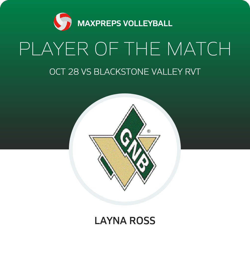 Congratulations to #10 Layna Ross for being selected the Greater New Bedford RVT Volleyball Player of the Match.