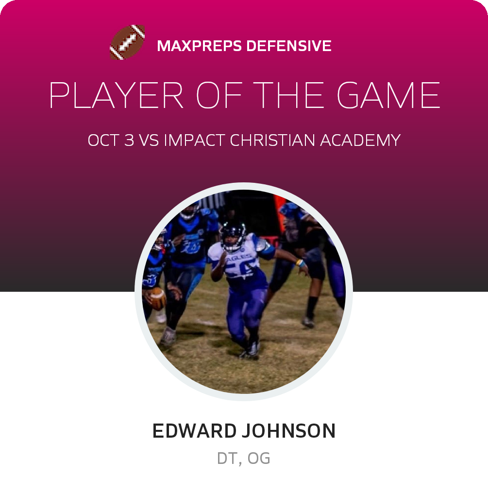 Congratulations to #56 Edward Johnson for being selected the Defensive Hollis Christian Academy Football Player of the Game.