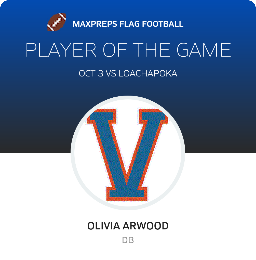 Congratulations to #23 Olivia Arwood for being selected the Valley Girls Flag Football Player of the Game.