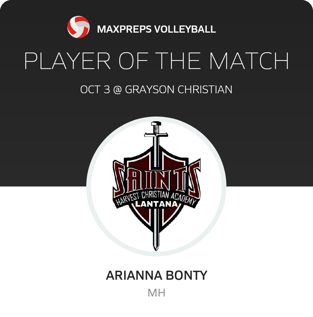 Congratulations to #7 Arianna Bonty for being selected the Harvest Christian Academy Volleyball Player of the Match.