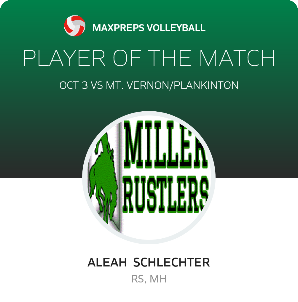 October 3, 2023: Miller, SD 57362 In Tuesday's non-league battle, the host Miller Rustlers volleyball team scored a  3-0 triumph over the Mt. Vernon/Plankinton Titans.