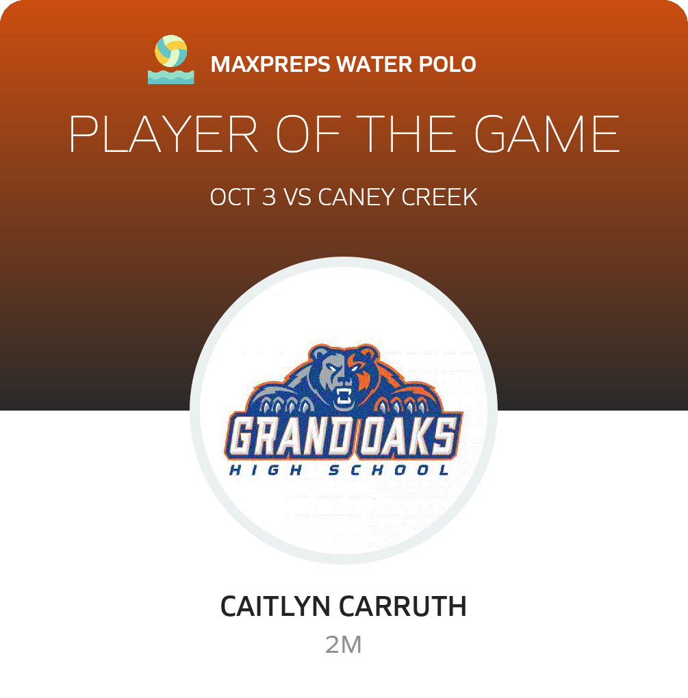Congratulations to #5 Caitlyn Carruth for being selected the Grand Oaks Girls Water Polo Player of the Game.