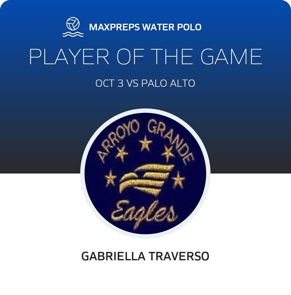 Congratulations to #2 Gabriella Traverso for being selected the Arroyo Grande Girls Water Polo Player of the Game.