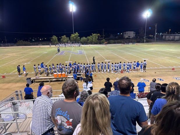 October 30, 2025: Needles, CA 92363 The crowd at Thursday's league contest between the Needles Mustangs (Needles, CA) and the visiting Lake Mead Christian Academy Eagles (Henderson, NV), witnessed Needles's football squad wallop Lake Mead Christian Academy by a tally of 36-0.