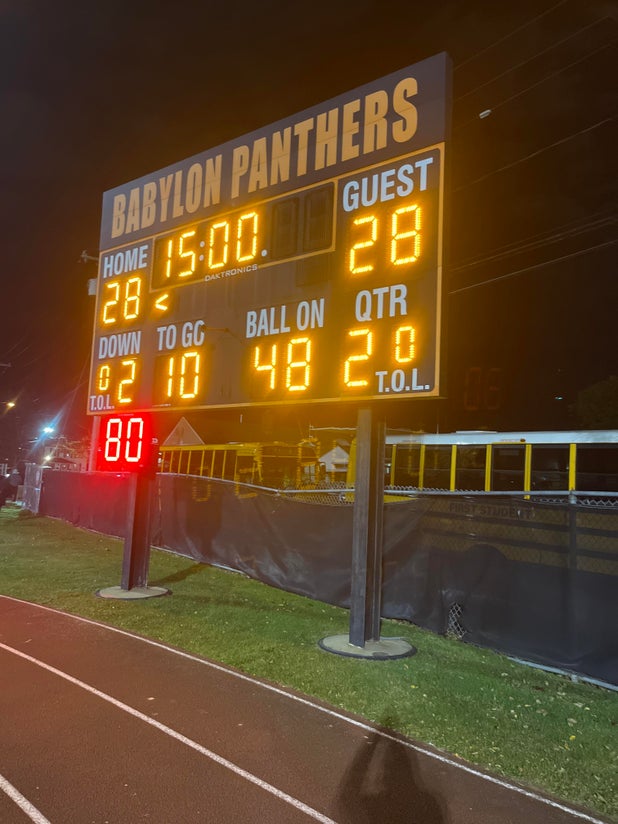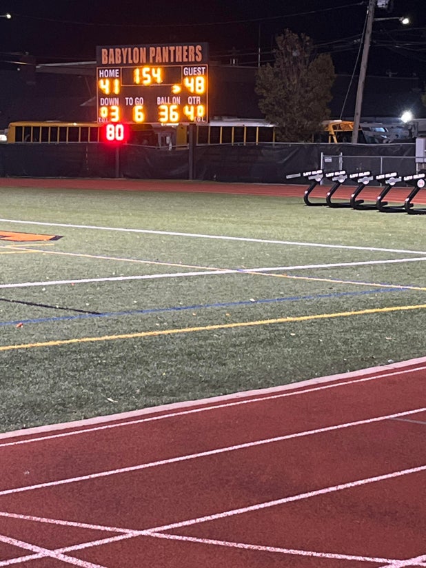 The Babylon (NY) varsity football team won Friday's home conference game against Miller Place (NY) by a score of 49-48.