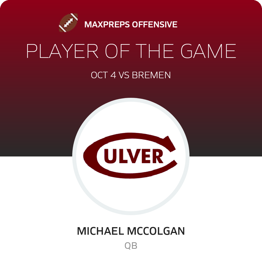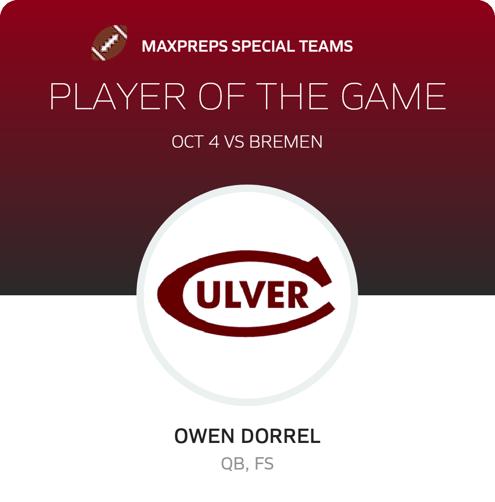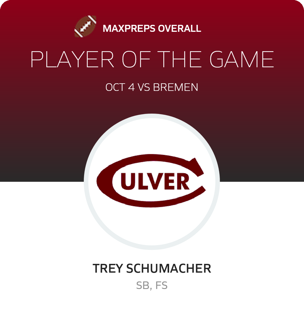 Congratulations to #9 Trey Schumacher (overall), #2 Michael Mccolgan (offensive), #64 William Kershner (defensive) and #12 Owen Dorrel (special teams) for being selected the Culver Academies Football Players of the Game.