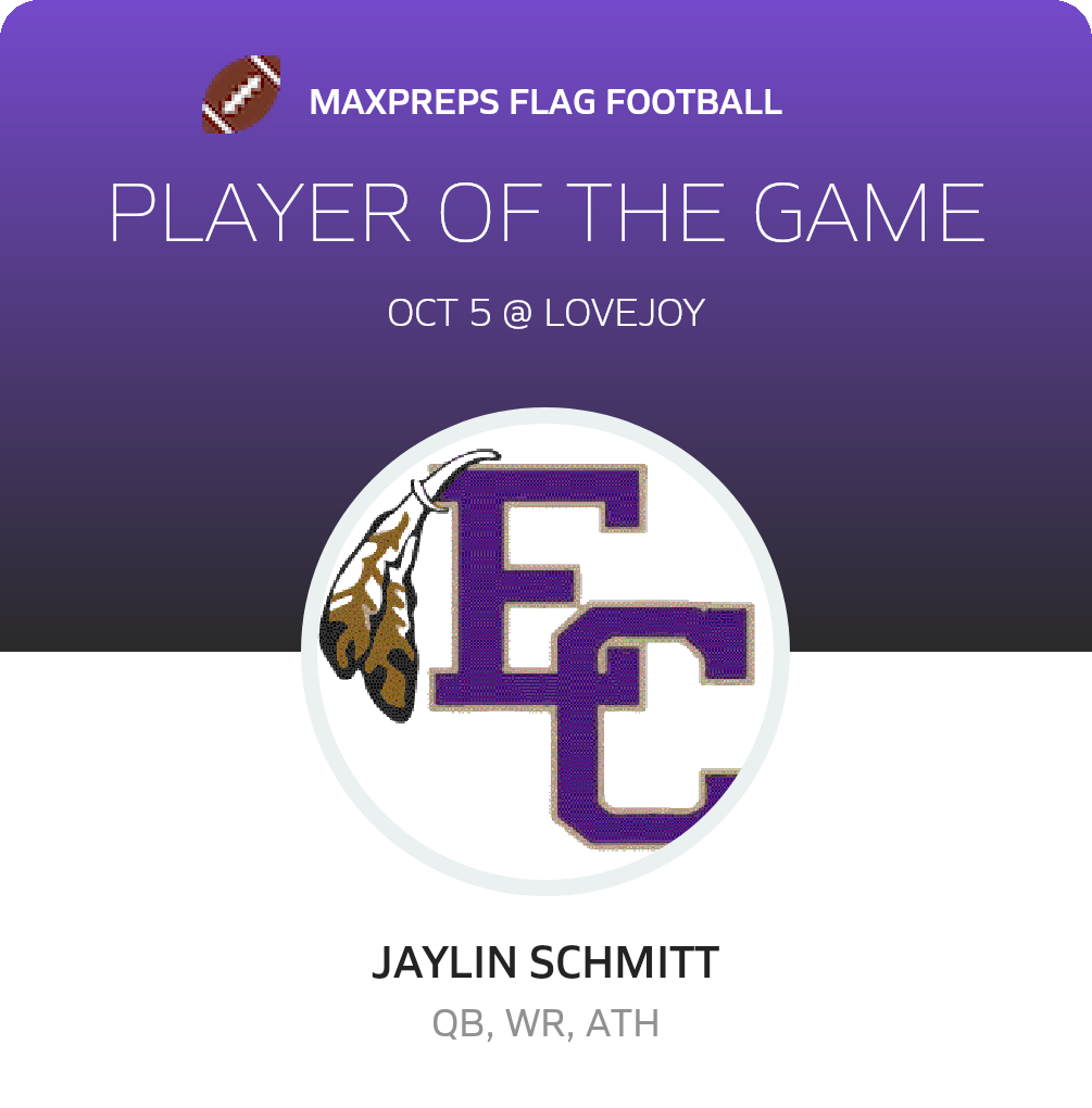 Congratulations to #5 Jaylin Schmitt for being selected the East Coweta Girls Flag Football Player of the Game.
