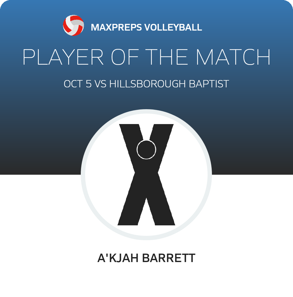 Congratulations to #20 A'Kjah Barrett for being selected the Candlelight Christian Academy JV Volleyball Player of the Match.