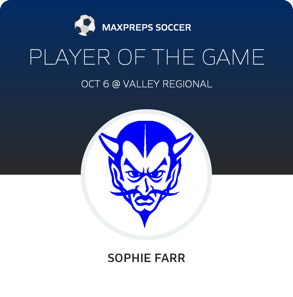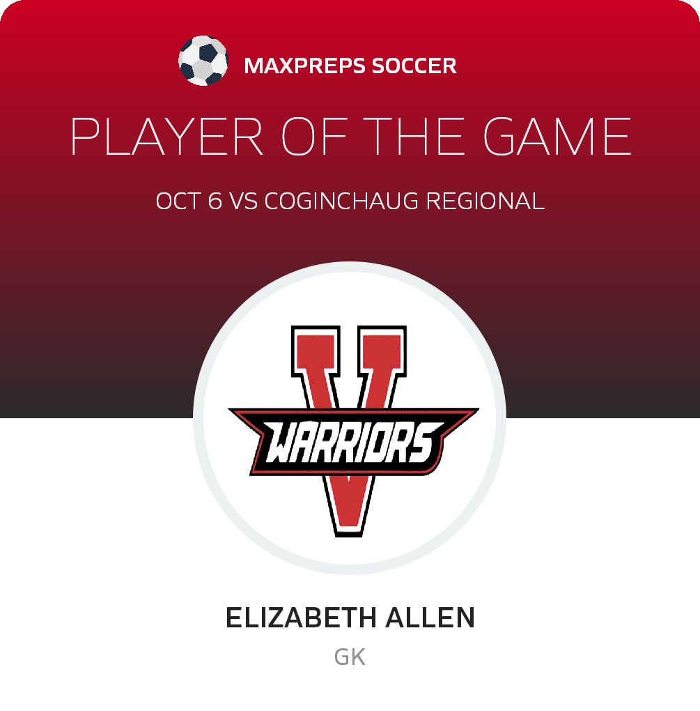 Congratulations to #1 Elizabeth Allen for being selected the Valley Regional Girls Soccer Player of the Match.