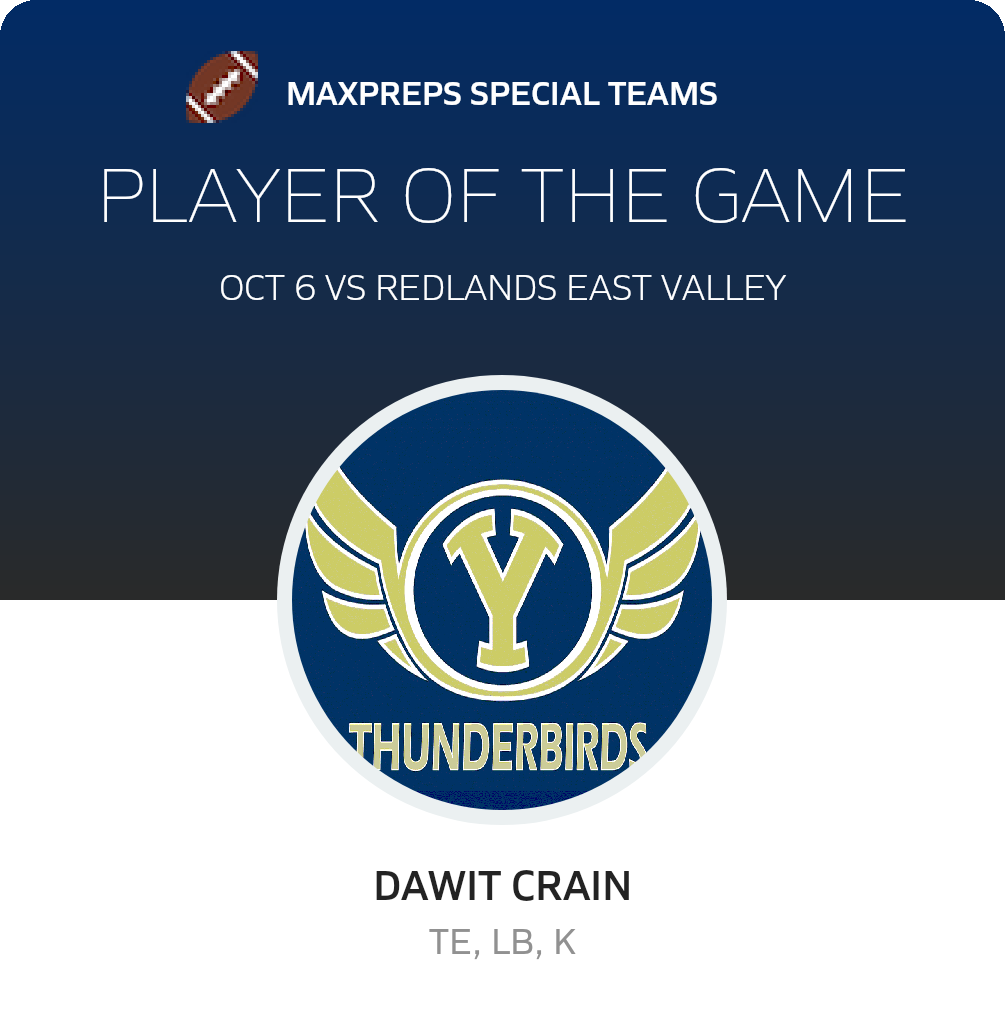 The Thunderbirds (6-1) will now prepare for their challenge against Redlands (Redlands, CA). The Terriers come into the Citrus Belt challenge with a 4-3 record. In their last challenge, Redlands was ripped by Cajon (San Bernardino, CA), 36-0, in a league challenge.