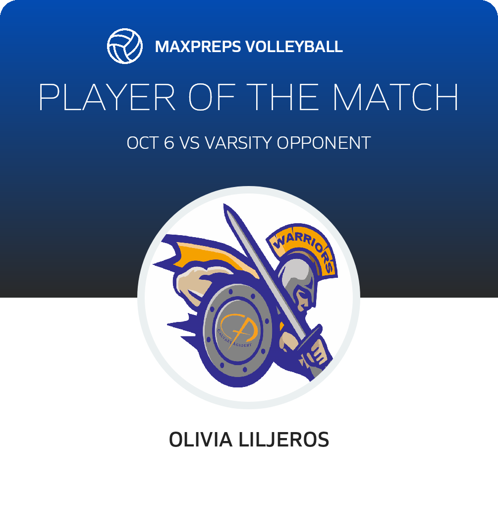 Congratulations to #10 Olivia Liljeros for being selected the Calvary Academy Volleyball Player of the Match.