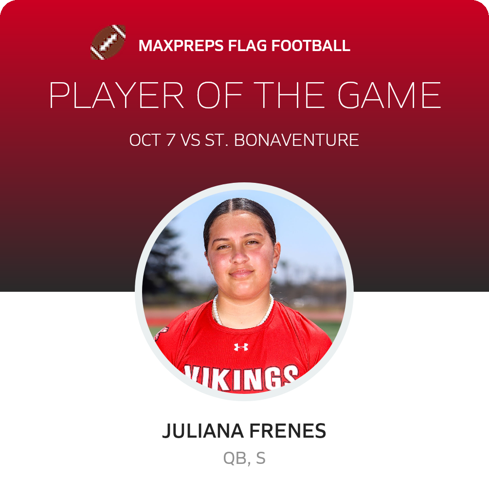 Congratulations to #0 Juliana Frenes for being selected the Hueneme Girls Flag Football Player of the Game.
