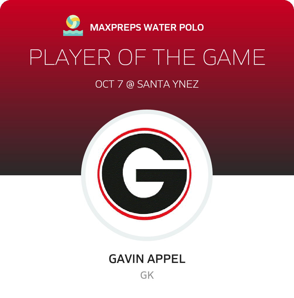 Congratulations to Gavin Appel for being selected the Glendora Water Polo Player of the Game.