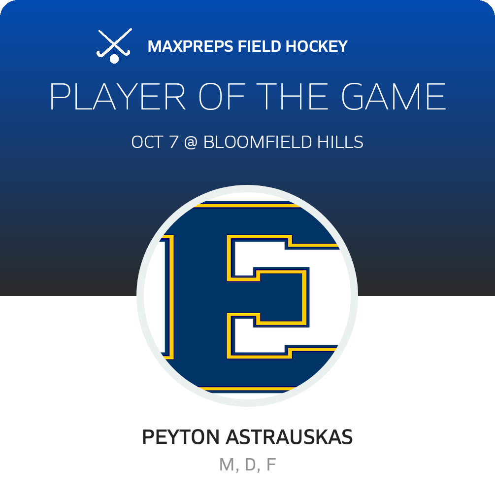 Congratulations to #16 Peyton Astrauskas for being selected the East Grand Rapids Field Hockey Player of the Game.