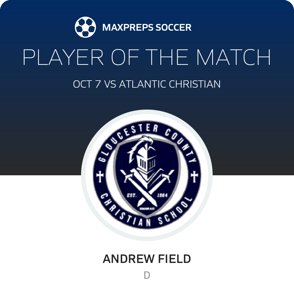 Congratulations to #8 Andrew Field for being selected the Gloucester County Christian Soccer Player of the Match.