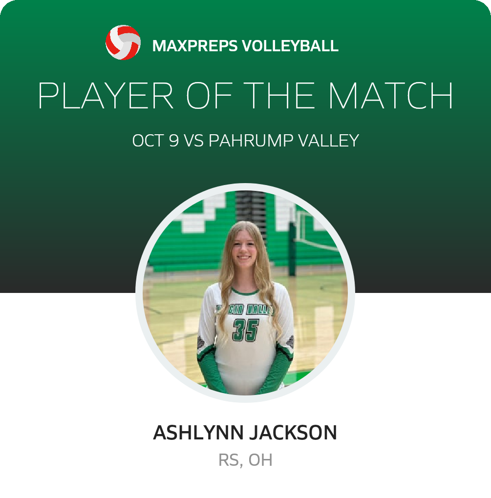 Congratulations to #7 Ashlynn Jackson for being selected the Virgin Valley JV Volleyball Player of the Match.