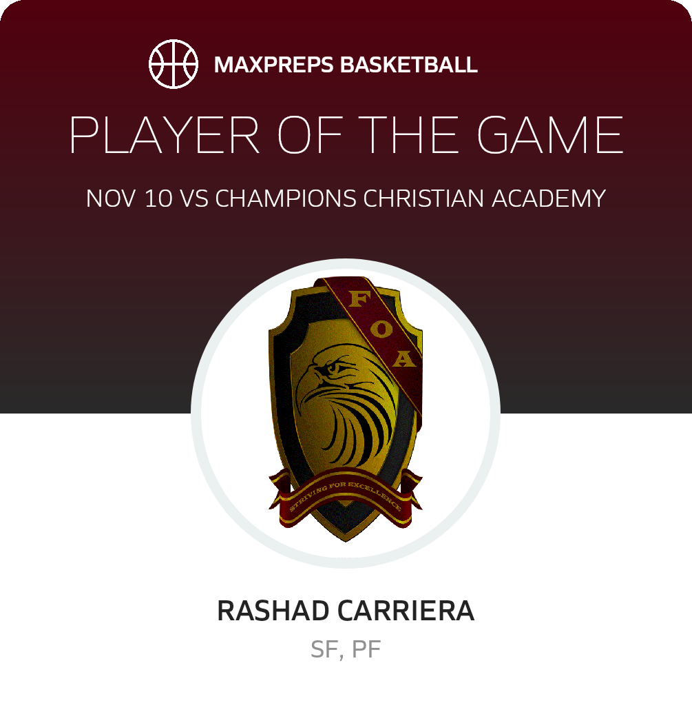 November 10, 2025: Tampa, FL 33615 In Monday's non-league test, the Faith Outreach Academy Eagles (Tampa, FL) basketball squad trounced the visiting Champions Christian Academy Lions (Davenport, FL), by a tally of 69-31.