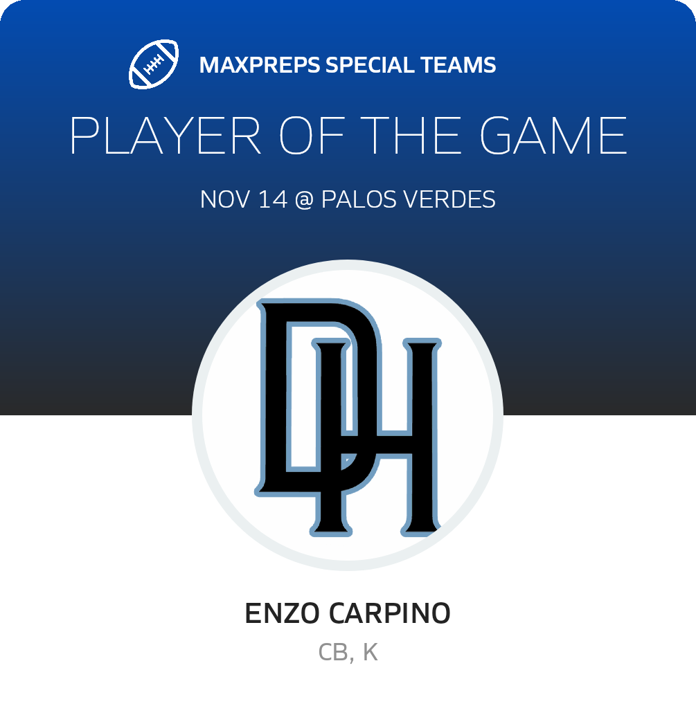 Congratulations to #21 Micah Langohr (overall), #6 Jack Norman (offensive), #15 Thompson Foulger (defensive) and #38 Enzo Carpino (special teams) for being selected the Dana Hills Football Players of the Game.