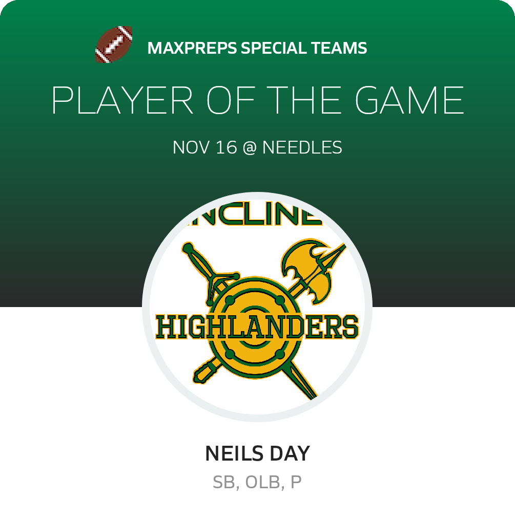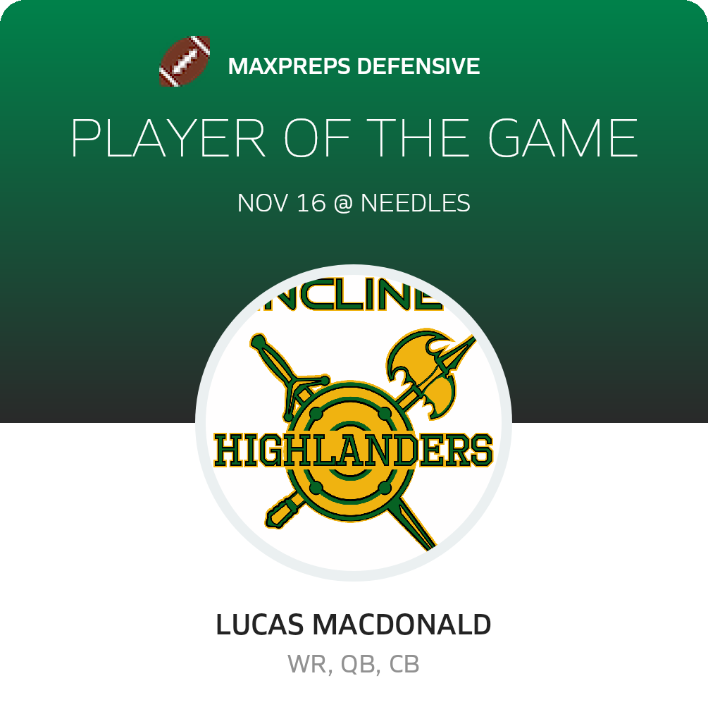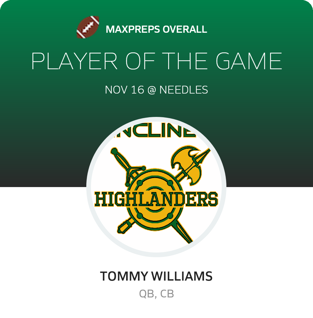 In their next game, the Highlanders battle the Pershing County Mustangs (Lovelock, NV) in a non-league game, on Saturday, November 23. Incline will attempt to better on its 10-0 season record. The Mustangs go into the challenge with a 11-0 record after their 51-7 non-league win over Lincoln County (Panaca, NV).