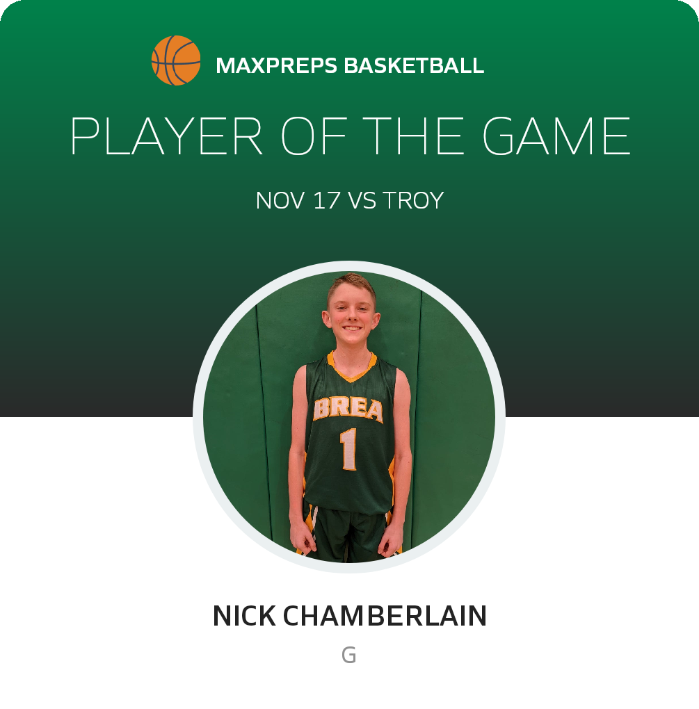 Congratulations to #1 Nick Chamberlain for being selected the Brea Olinda Freshman Basketball Player of the Game.