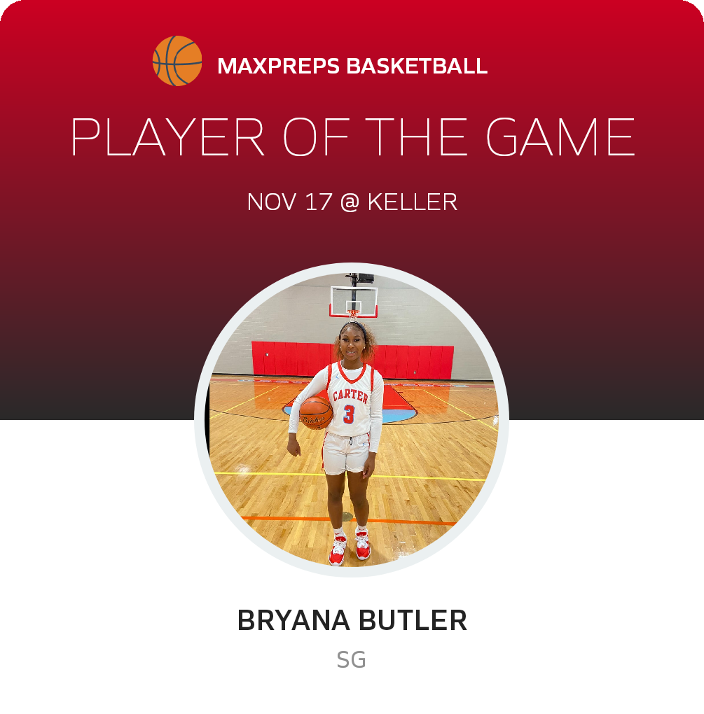 Congratulations to #3 Bryana Butler for being selected the Carter Girls Basketball Player of the Game.