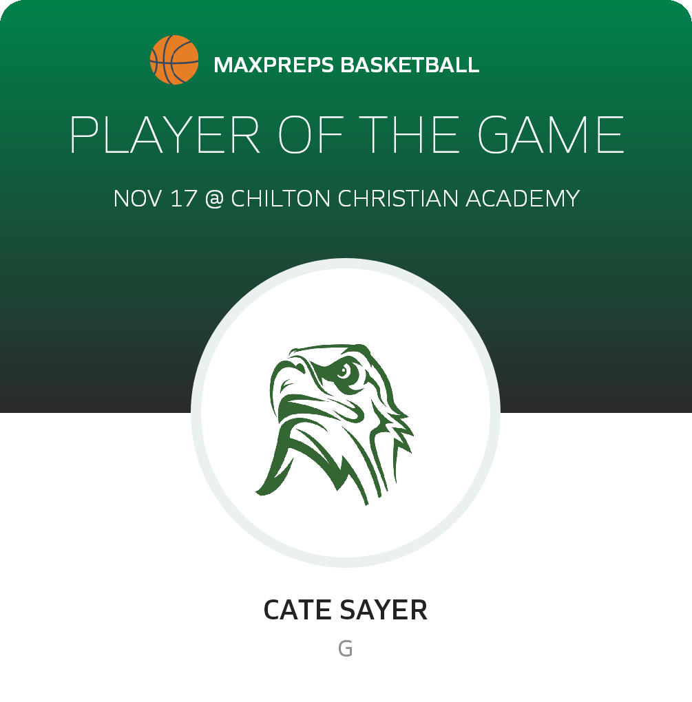 Congratulations to #12 Cate Sayer for being selected the Victory Christian Academy Girls Basketball Player of the Game.
