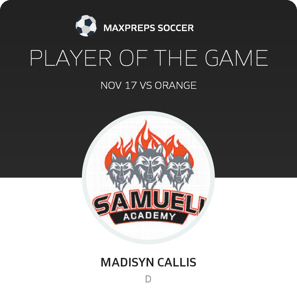 Congratulations to Madisyn Callis for being selected the Samueli Academy Girls Soccer Player of the Match.