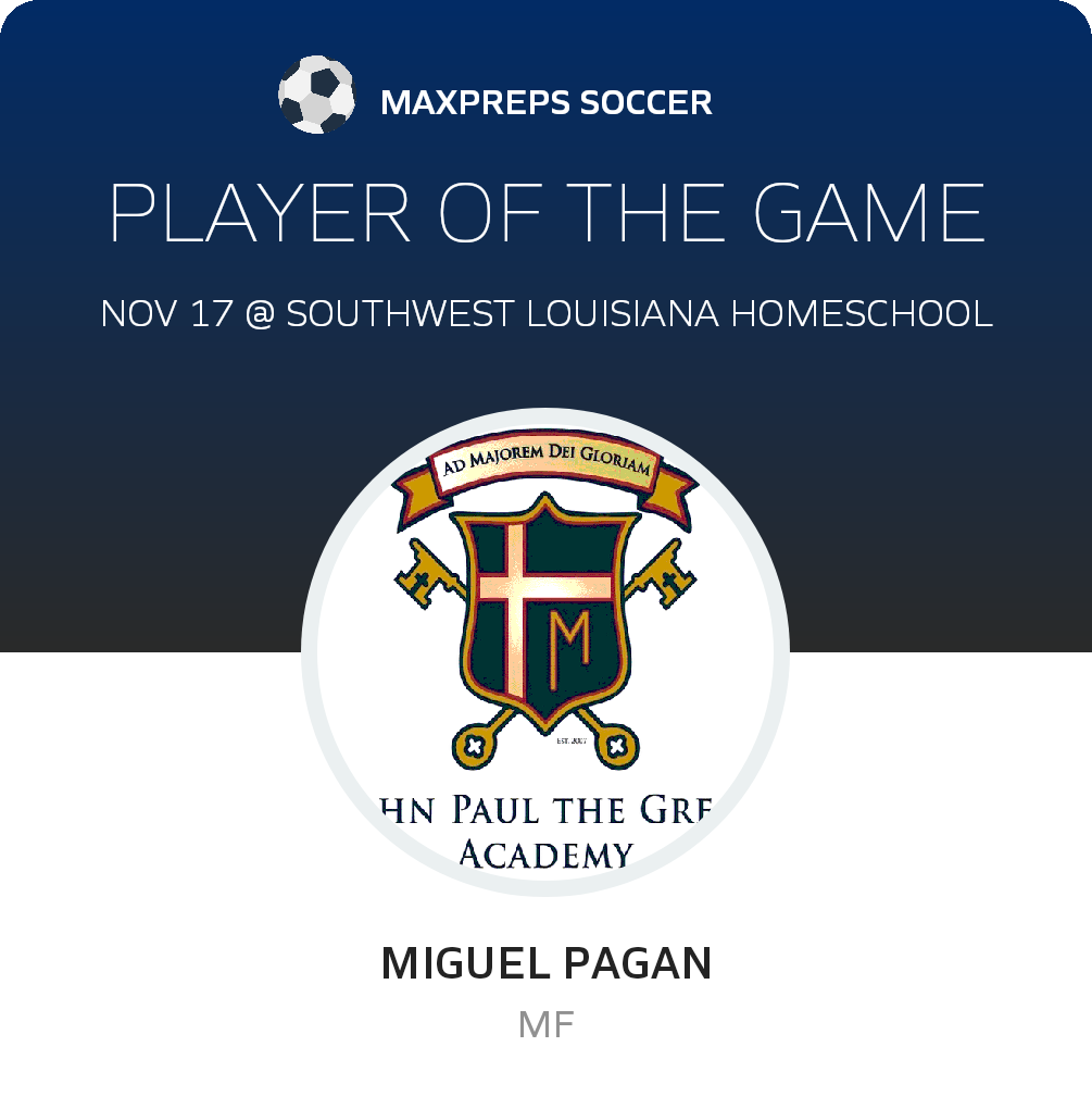 Congratulations to #16 Miguel Pagan for being selected the John Paul the Great Academy Soccer Player of the Match.
