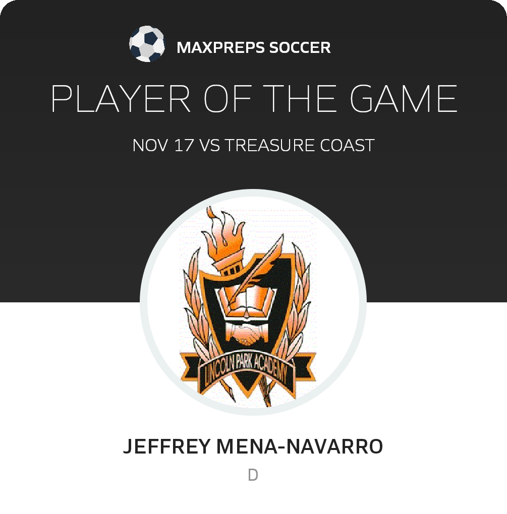 Congratulations to #23 Jeffrey Mena-navarro for being selected the Lincoln Park Academy Soccer Player of the Match.