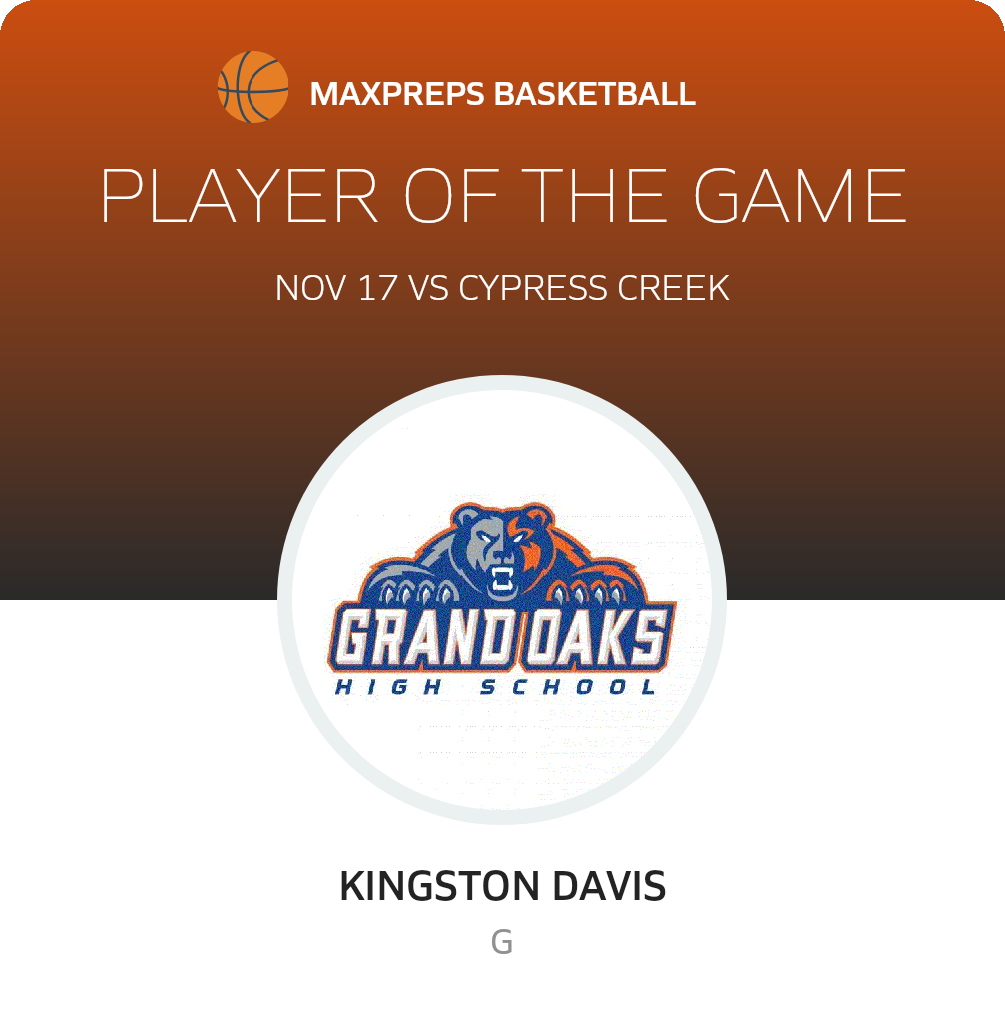 Congratulations to #14 Kingston Davis for being selected the Grand Oaks Freshman Basketball Player of the Game.