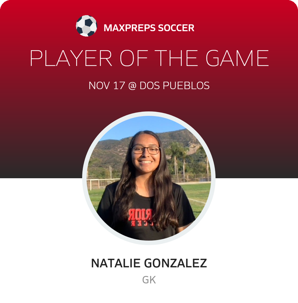 Congratulations to #00 Natalie Gonzalez for being selected the Carpinteria Girls Soccer Player of the Match.