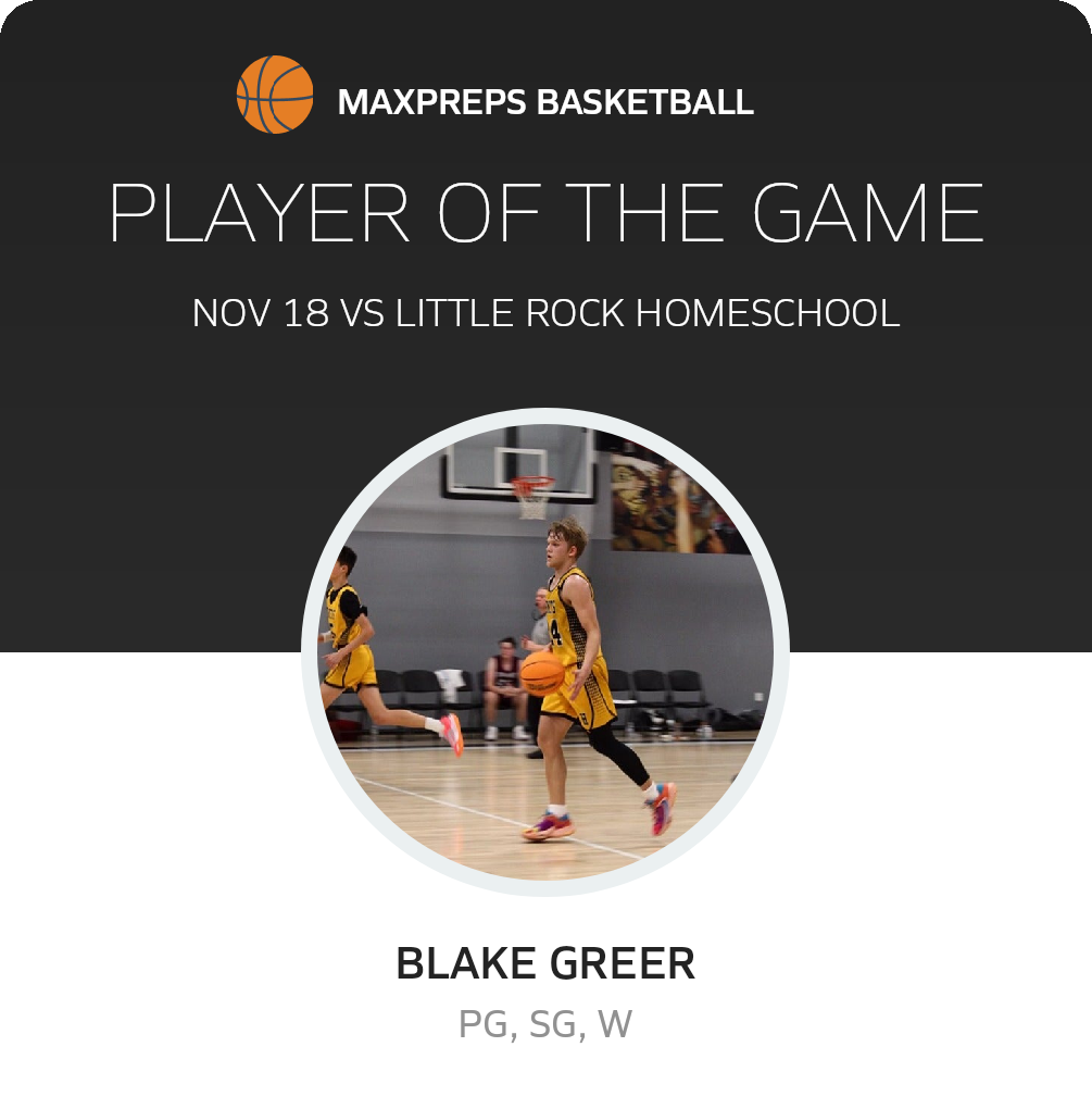 Congratulations to #24 Blake Greer for being selected the Northwest Arkansas HomeSchool Hornets Basketball Player of the Game.
