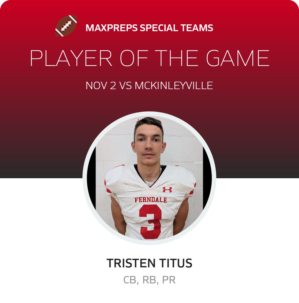 In their next game, the Wildcats play the Arcata Tigers (Arcata, CA) in a Humboldt-Del Norte - Little 4 challenge, on Saturday, November 9. Ferndale will attempt to improve on its 8-1 season record. The Tigers go into the challenge with a 9-0 record after their 60-6 league win over Hoopa Valley (Hoopa, CA).
