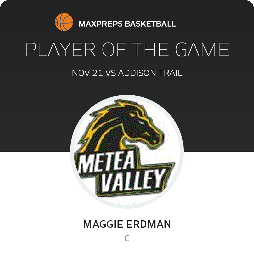 Congratulations to #13 Maggie Erdman for being selected the Metea Valley Girls Basketball Player of the Game.
