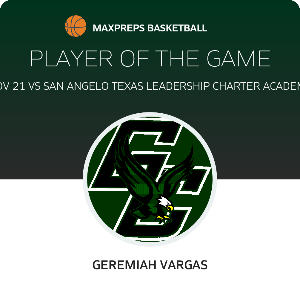 Congratulations to #2 Geremiah Vargas for being selected the Grape Creek JV Basketball Player of the Game.