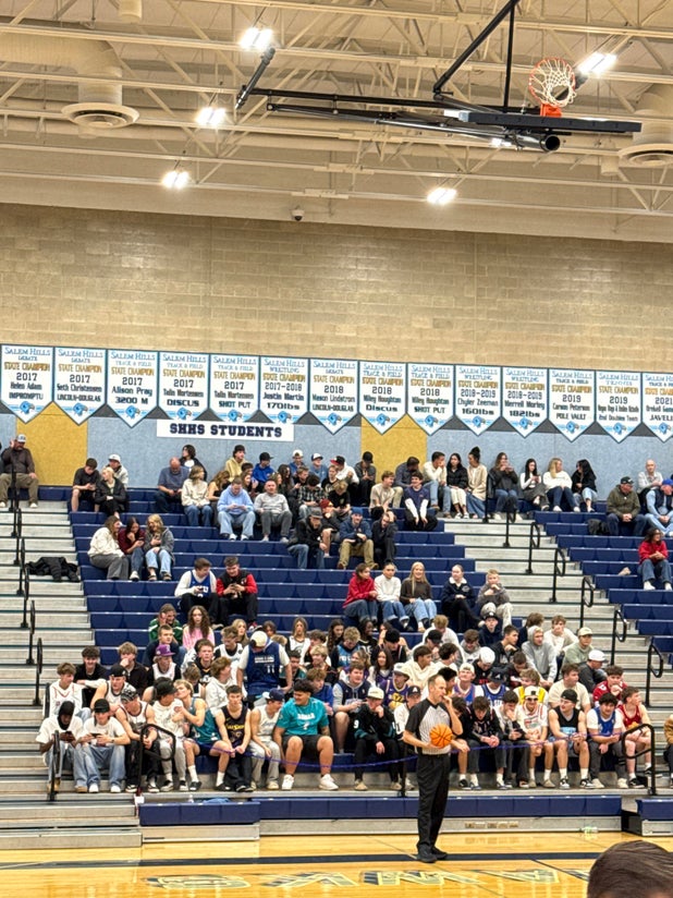 November 21, 2025: Salem, UT 84653 The crowd at Friday's non-league challenge between the Cedar Valley Aviators (Eagle Mountain, UT) and the host Salem Hills Skyhawks (Salem, UT), observed Cedar Valley's basketball squad hold off Salem Hills by a count of 75-70.