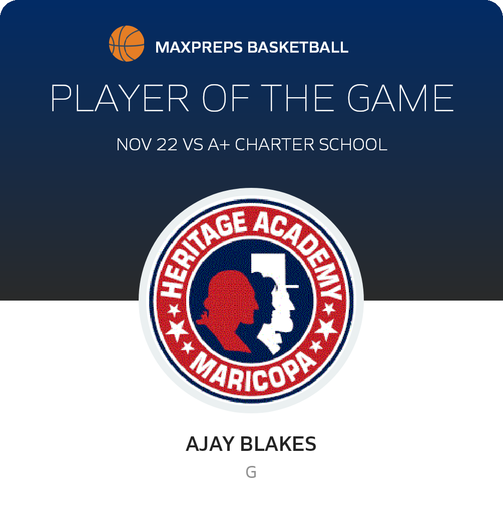 Congratulations to #11 Ajay Blakes for being selected the Heritage Academy Basketball Player of the Game.