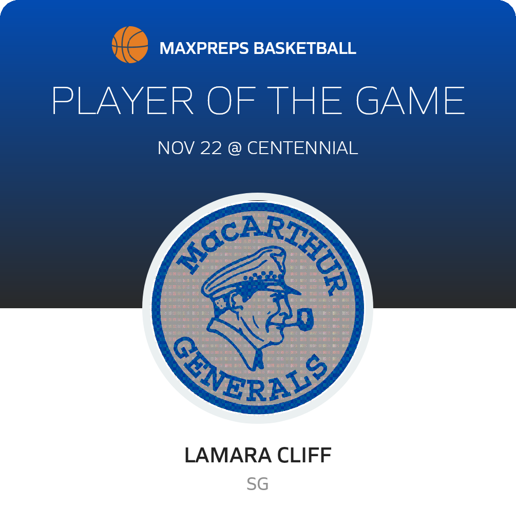 Congratulations to #22 Lamara Cliff for being selected the MacArthur Girls Basketball Player of the Game.