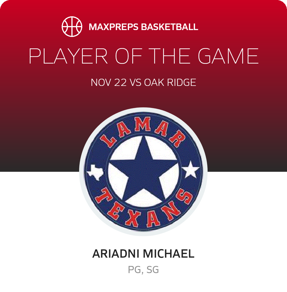 Congratulations to #15 Ariadni Michael for being selected the Lamar Girls Basketball Player of the Game.