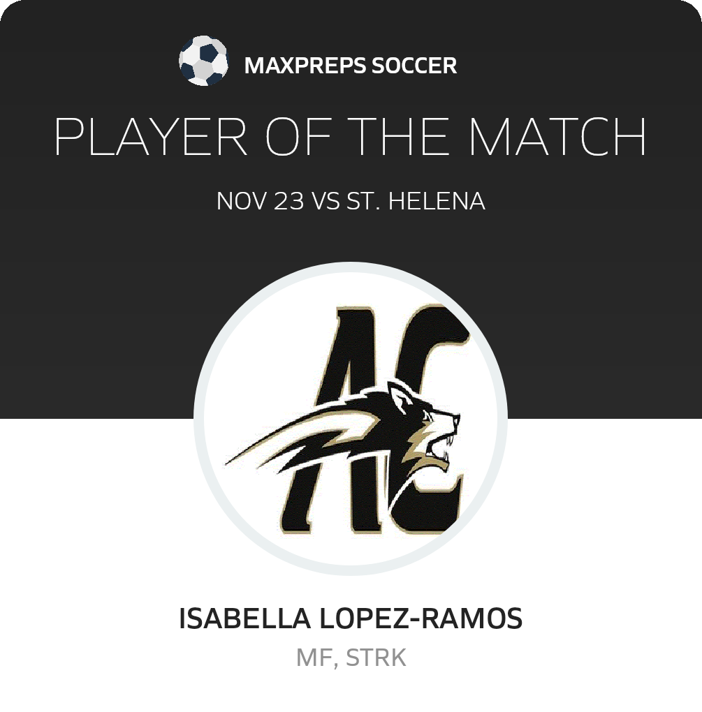Congratulations to #16 Isabella Lopez-Ramos for being selected the American Canyon Girls JV Soccer Player of the Match.