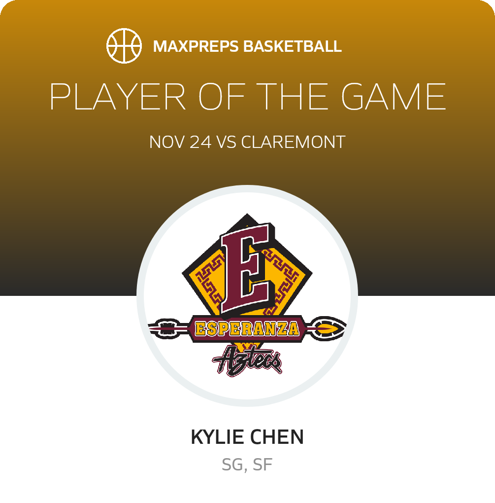 Congratulations to #35 Kylie Chen for being selected the Esperanza Girls Basketball Player of the Game.