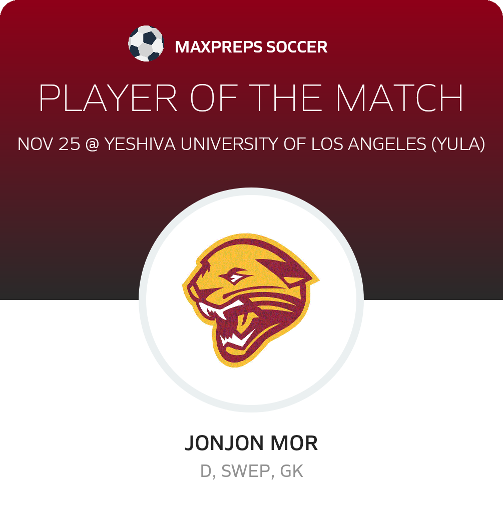 Congratulations to #6 Isaac Cate for being selected the Yeshiva University of Los Angeles (YULA) Soccer Player of the Match.