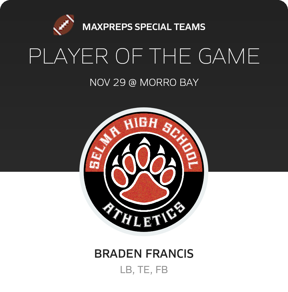 Congratulations to #4 Jacob Hernandez (overall), #1 Aaron Ramirez (offensive), #5 Kayden Berry (defensive) and #9 Braden Francis (special teams) for being selected the Selma Football Players of the Game.