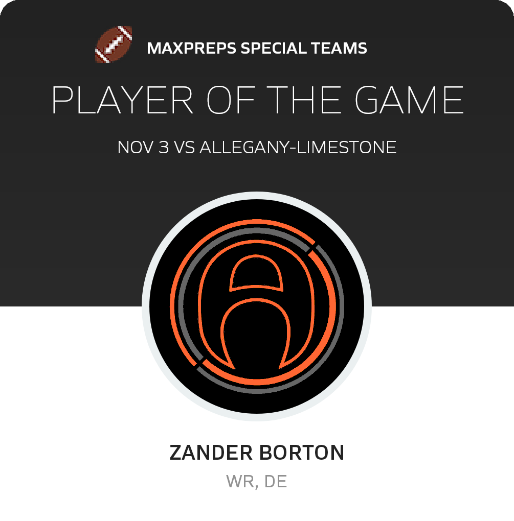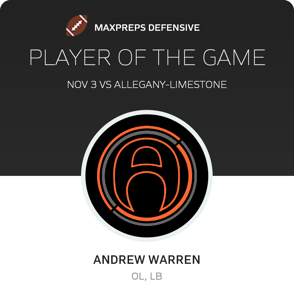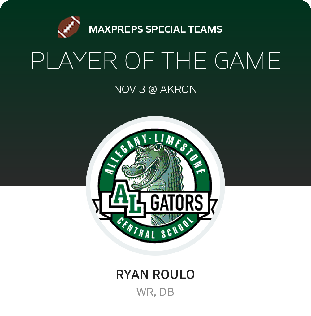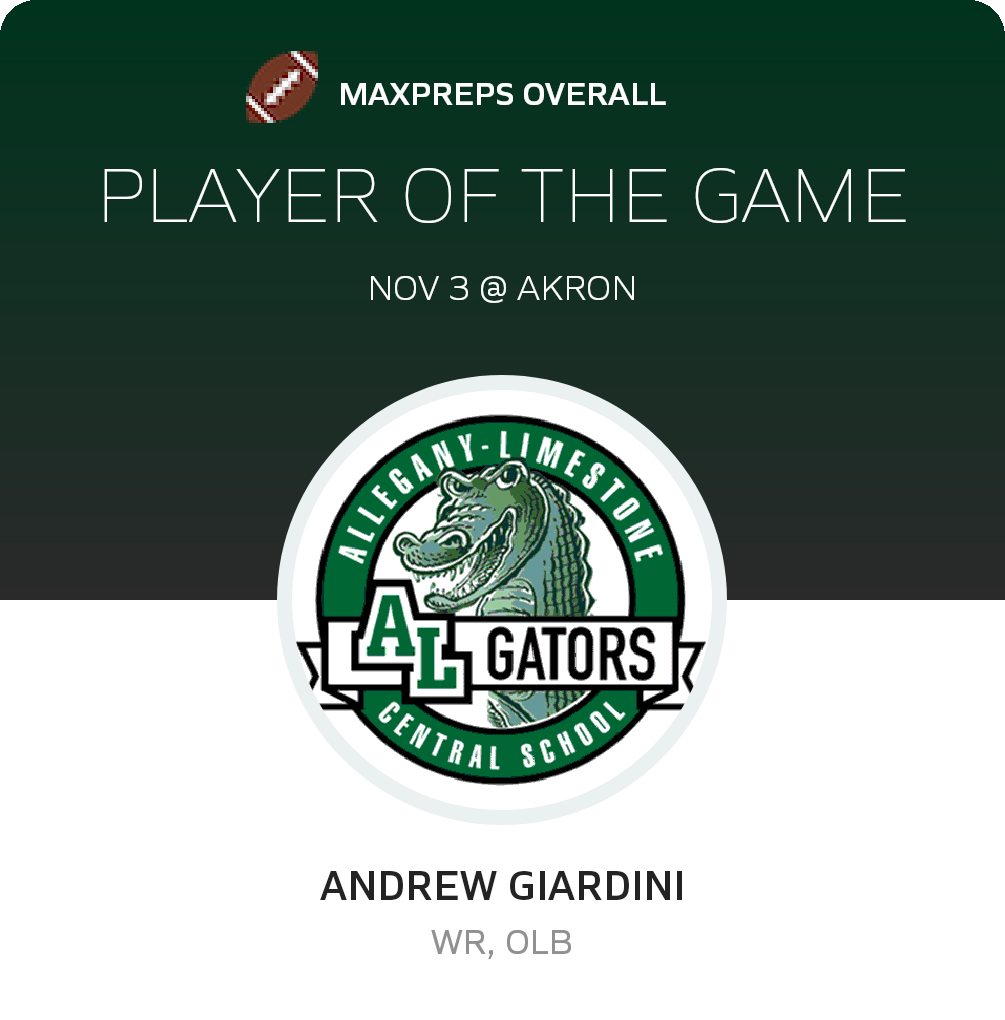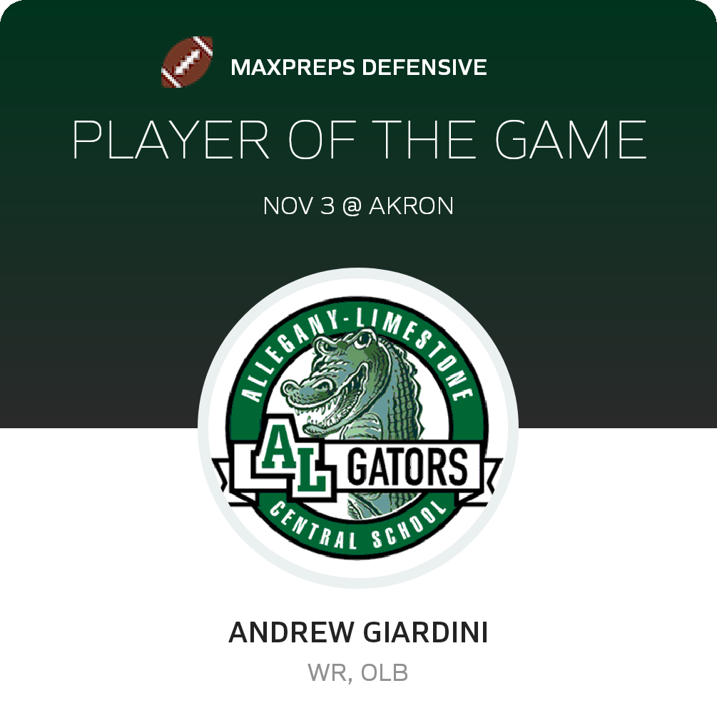 Congratulations to #6 Andrew Giardini (overall, offensive and defensive) and #4 Ryan Roulo (special teams) for being selected the Allegany-Limestone Football Players of the Game.