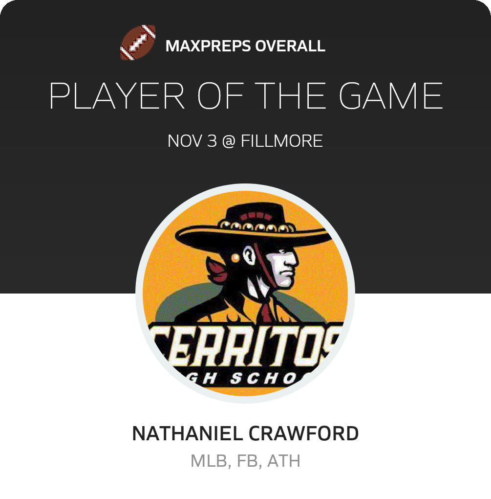 Congratulations to #0 Nathaniel Crawford (overall), #3 Josh Park (offensive) and #8 Tyler Ky (defensive) for being selected the Cerritos Football Players of the Game.