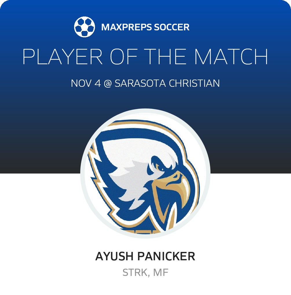 Congratulations to #9 Ayush Panicker for being selected the Lakewood Ranch Preparatory Academy Soccer Player of the Match.