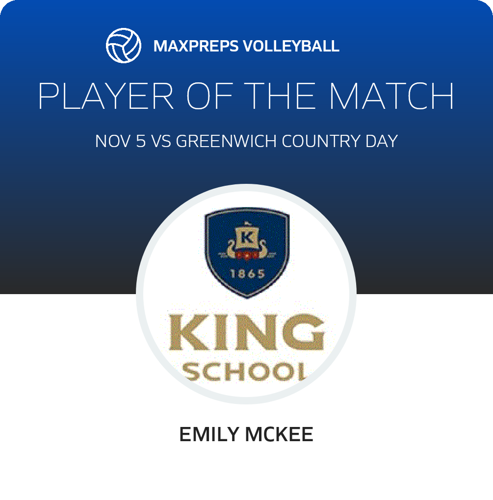The King (Stamford, CT) varsity volleyball team won Wednesday's home conference tournament match against Greenwich Country Day (Greenwich, CT) by a score of 3-0.